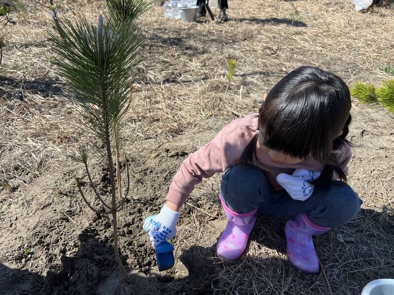 松の苗木を一本一本植樹して