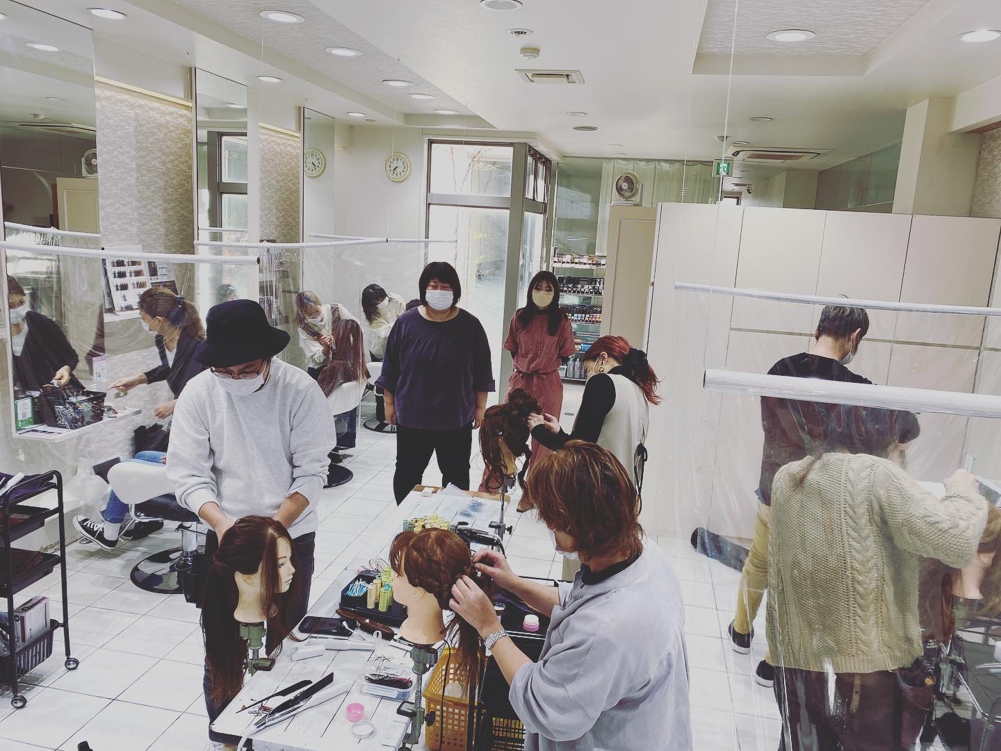 企画兼講師役のヘアメイクスタッフが見守る中、真剣にウィッグと向き合い、程よい緊張感と時々笑いのある朝のいい時間でしたー!